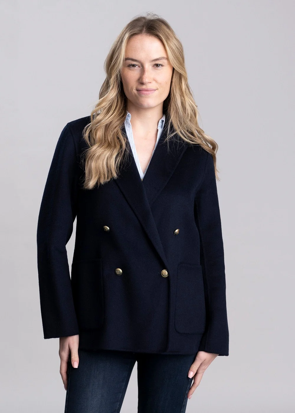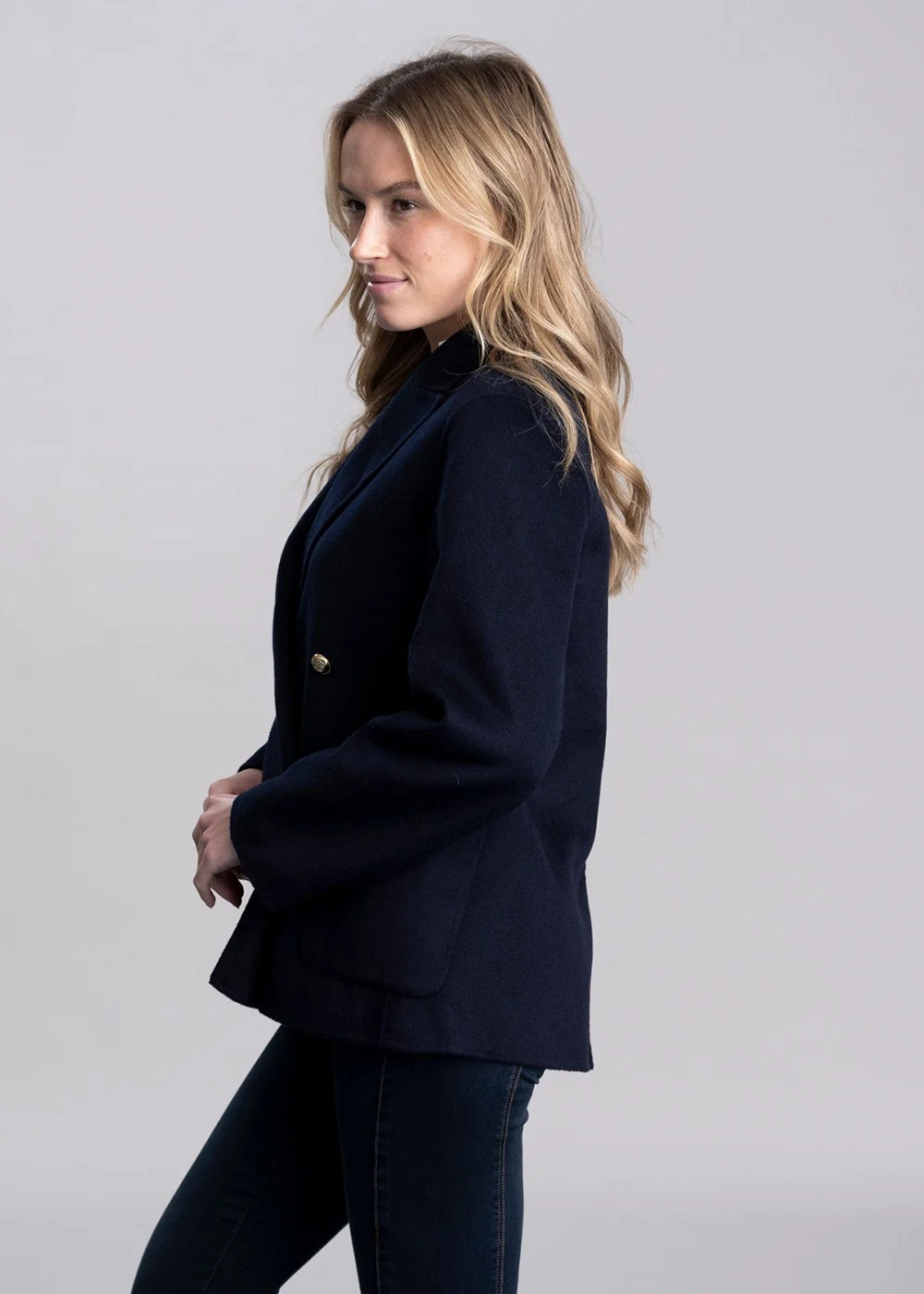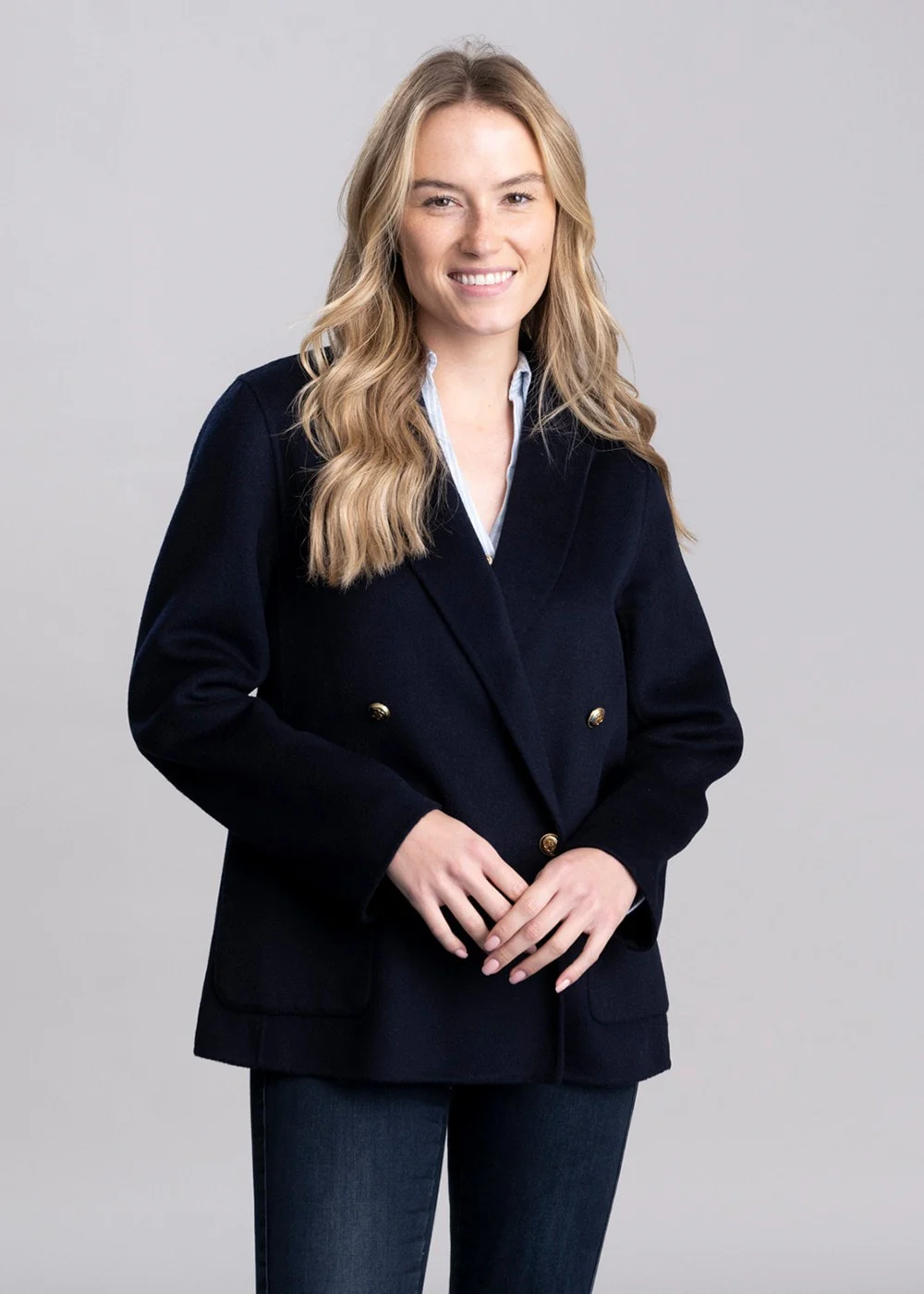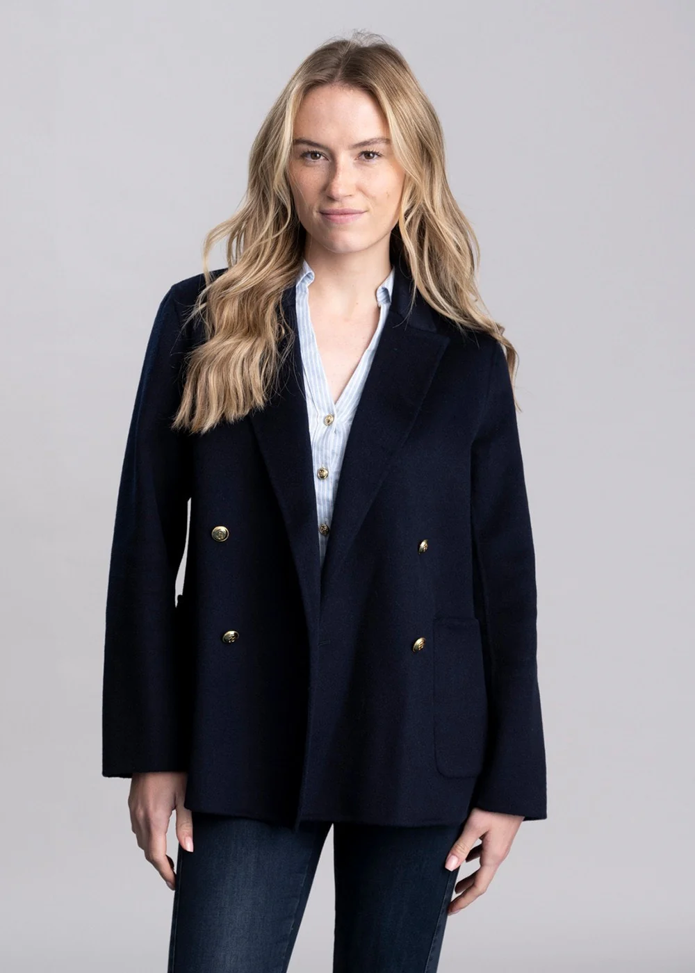 • Double breasted with button closure