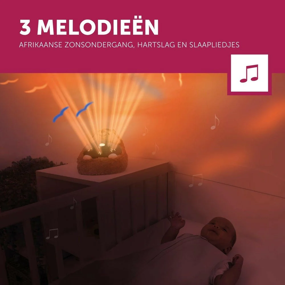 Deze slaap projector is voor ouders een veilige keuze om je kind heerlijk rustig in slaap te laten vallen. En door de huilsensor weet je ook dat er een vriendje met warm licht en geluid aanspringt als je baby s ’nacht toch wakker word en moet huilen. Deze zonsondergang projector werkt met veilig LED licht, voldoet natuurlijk aan de EU-regelgeving en is geschikt voor gebruik vanaf de geboorte.